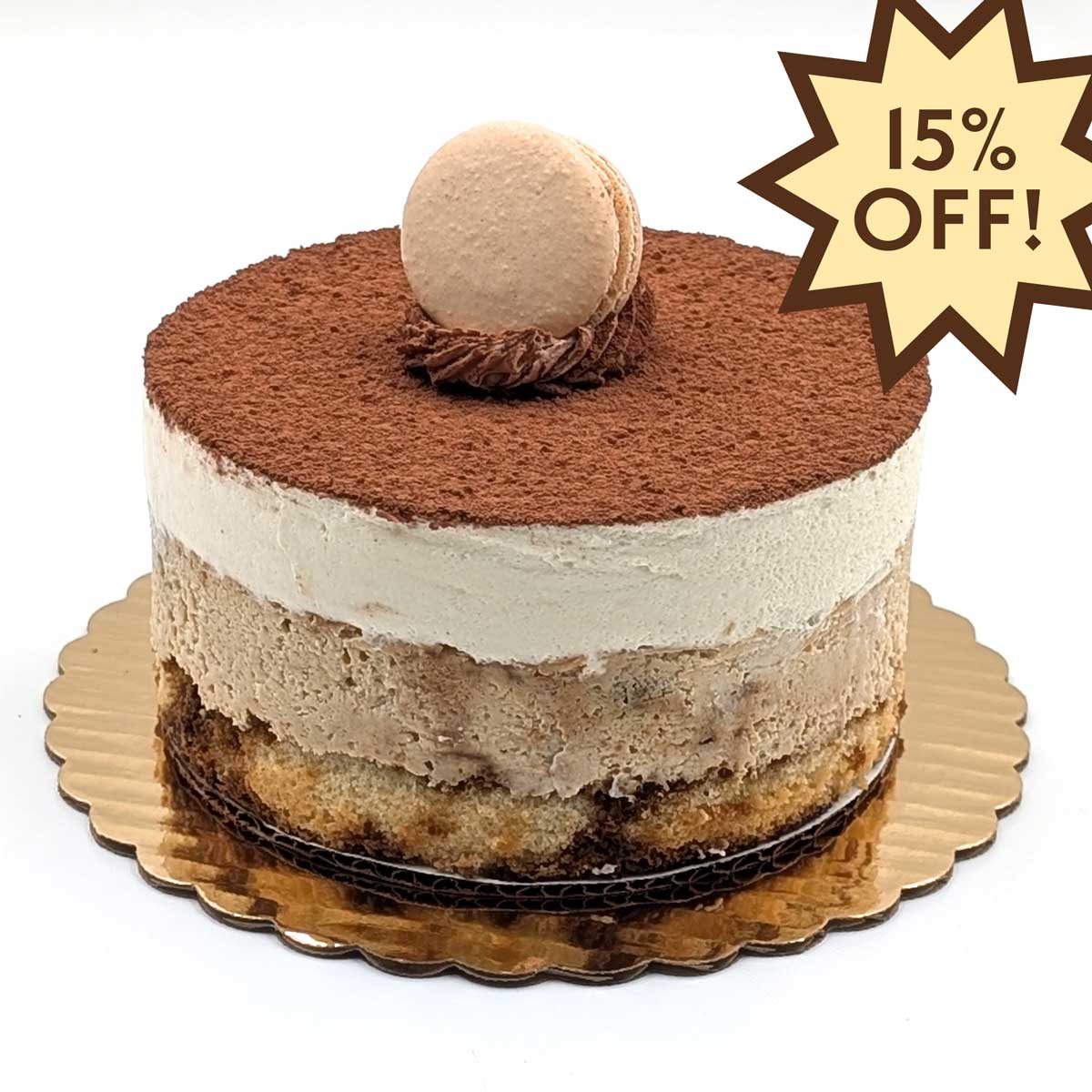 Regular price $33.10A delicious tiramisu-based cheesecake with coffee-soaked vanilla chiffon cake and ladyfingers. Layered with coffee liqueur-flavored mascarpone cheese (contains alcohol). Please allow a full 48 hour notice for special orders.
